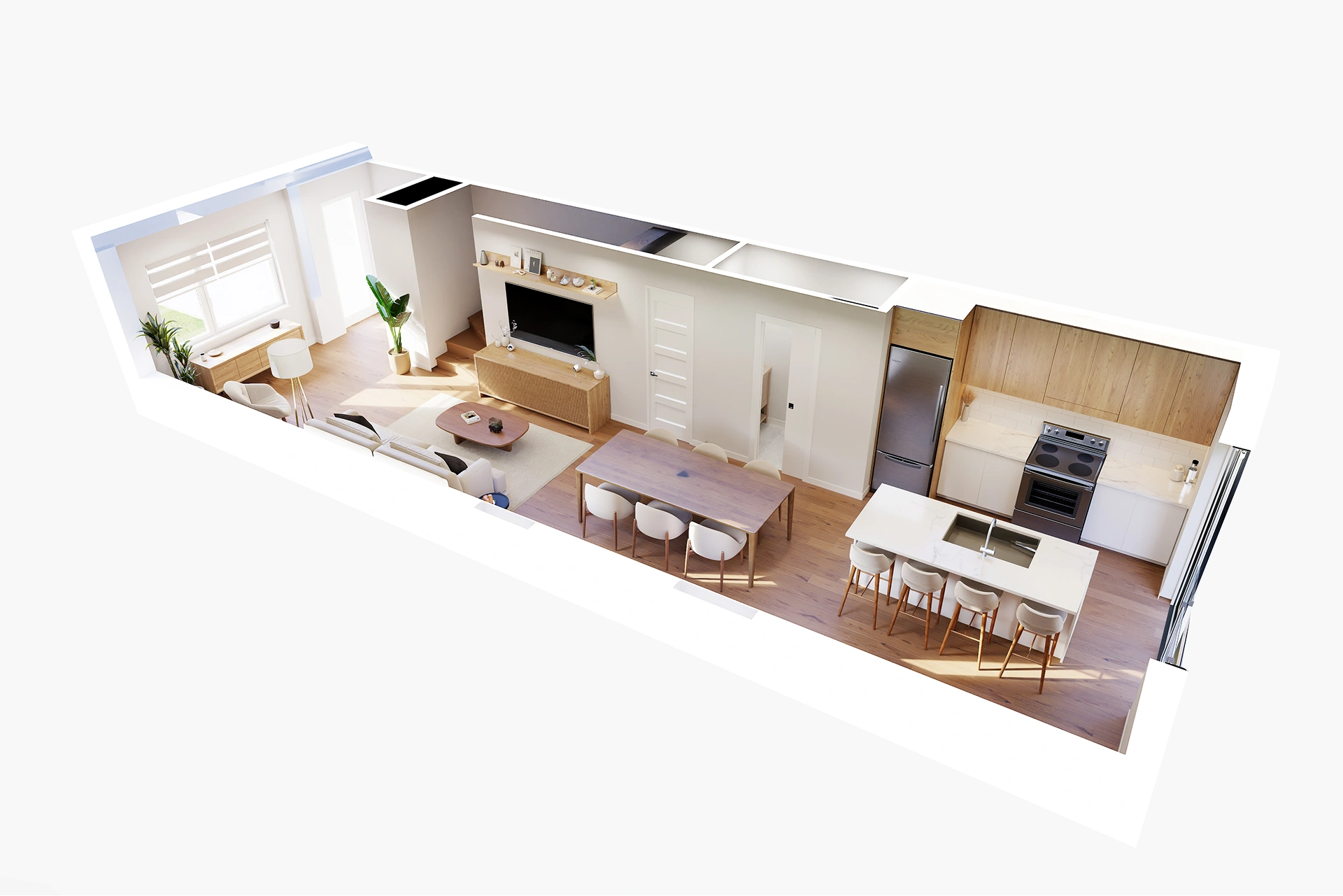 Découvrez un projet résidentiel de qualité au cœur de Saint-Jean-sur-Richelieu, au 412 Saint-George. Trois condos modernes de 1290 pi², offrant 2 à 3 chambres et des espaces lumineux à aire optimisée. Profitez d’une grande fenestration, d’une cuisine contemporaine avec comptoirs en quartz et d’une salle de bain avec bain et douche séparés. Climatisation, échangeur d’air et insonorisation supérieure assurent un confort optimal au quotidien.